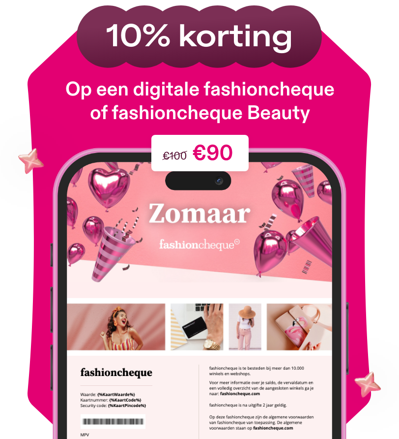 *Actie geldig t/m 31 januari 2026 via fashioncheque.com. De korting is uitsluitend geldig op digitale fashioncheques, met een maximale bestelwaarde van €1.500 per bestelling.